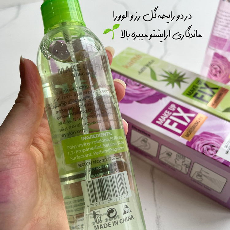 اسپری فیکس کاریته مناسب برای انواع پوست حاوی عصاره آلوئه ورا و گل رز تشکین دهنده پوست ضد التهاب و کاهش دهنده قرمزی آبرسان و مرطوب کننده عمیق نرم و لطیف کننده پوست جلوگیری از ایجاد خشکی بیش از حد در پوست افزایش دوام آرایش جلوگیری از ماسیده شدن میکاپ قابل استفاده بعد از آرایش روزانه و میکاپهای سنگین حجم کالا اسپری فیکس کاریته برای چه افرادی مناسب است: این محصول برای تمامی افراد با انواع پوست مناسب بوده و قابل استفاده است. استفاده از این محصول چه تاثیری دارد: با استفاده از اسپری فیکس کاریته دوام میکاپ صورت بیشتر شده و از ماسیده شدن آرایش جلوگیری میشود. نحوه استفاده: اسپری فیکس را در فاصله 8 تا 10 سانتی با صورت قرار دهید و به آرامی روی کل صورت اسپری کنید.