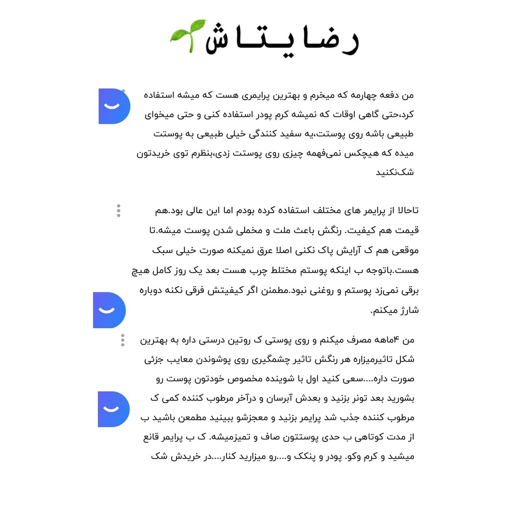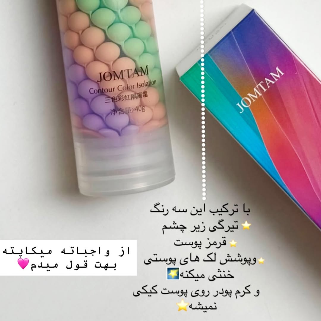 پرایمر رنگین کمانی جومتام اگر میکاپ موندگار و بدون نقص میخای باید اصولی ارایش کنی @pariha_shopp یکی از مراحل ارایش کردن ،پرایمر زدنه قیمت:175 راستی ثبت از دایر.ک و سایه رضایتاش اسلاید اخره این محصول با داشتن 3 رنگ عالی بنفش سبز و نارنجی می تواند به تنهایی تمامی نقص های صورت و یا آرایش شما را برطرف سازد. میتونید بدون کرمپودرم ازش استفاده کنید پایه ساز آرایش یا همان پرایمر خودمان می تواند بهترین مکمل برای انواع بی بی کرم یا کرم پودر باشد. پایه ساز رنگی محصولی عالی و فوق العاده برای زیر ساز آرایش است که نه تنها وظیفه آبرسانی به پوست را انجام می دهد بلکه باعث شفافیت و یکدست شدن پوست صورت می شود.پرایمر باعث ماندگاری آرایش شما می شود و با پر کردن منافذ و حفره های ریز پوست از هدر رفتن کرم پودر جلوگیری می کند. اورجینال تنظیم کننده تناژ پوست افزایش دوام آرایش بهترین زیر ساز آرایش و بهترین مکمل برای کرم پودر پر کننده منافذ پوست جلوگیری از چرب شدن و برق افتادن پوست مواد غلیظ و به صرفه آبرسان قوی پوست نحوه استفاده: یکبار از پرایمر پمپ کنید و روی قسمت هایی از صورت که دارای منافذ باز می باشد و یا روی کل صورت پخش و ماساژ دهید تا جذب شود. به مدت 5 الی 10 دقیقه صبر کنید و سپس کرم پودر خود را استفاده کنید. این محصول علاوه بر اینکه یک زیر ساز آرایش عالی محسوب می شود به طور روزانه برای آبرسانی و مرطوب کردن پوست هم می توان استفاده کرد.